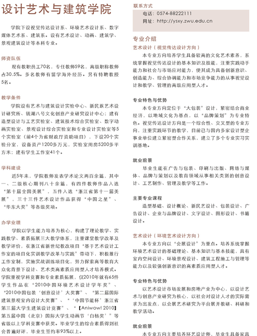 設(shè)計藝術(shù)與建筑學(xué)院是浙江萬里學(xué)院下屬的9個二級學(xué)院之一,始建于1999年?,F(xiàn)設(shè)視覺傳達(dá)設(shè)計系、環(huán)境藝術(shù)設(shè)計系、數(shù)字媒體藝術(shù)系、建筑系及藝術(shù)與建筑設(shè)計實驗中心、設(shè)計文化創(chuàng)意產(chǎn)業(yè)研究中心;建有4個實驗室(其中3個為省財政廳資助項目),18個實驗分室,已投入經(jīng)費959萬元,實驗室建筑面積5315平方米。擁有藝術(shù)設(shè)計、動畫、美術(shù)學(xué)、建筑學(xué)、景觀建筑設(shè)計等本科專業(yè)?,F(xiàn)在校學(xué)生1853人,有教職員工70余名,專任教師67名,其中教授4名,高級職稱教師22名。70℅的教師具有碩士、博士學(xué)位,多名教師有留學(xué)海外經(jīng)歷。另有特聘教授、兼職教師若干名。