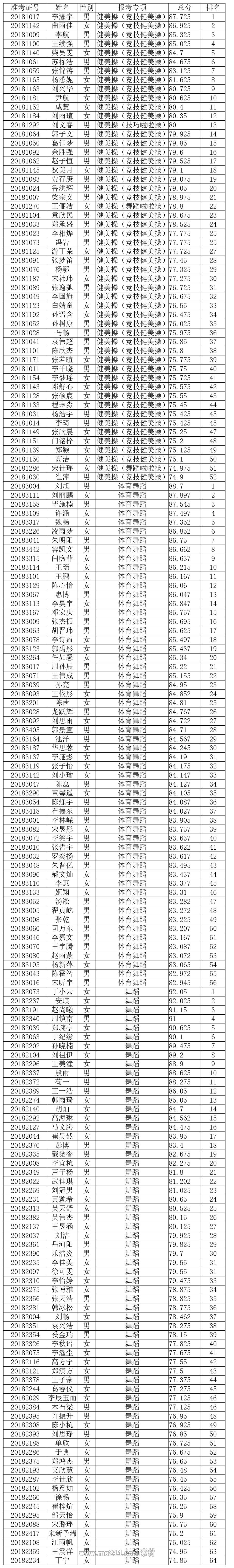 專業(yè)合格線:健美操74.9分、舞蹈74.85分、體育舞蹈82.945分。