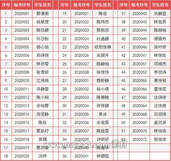 按報(bào)名序號排序,具體成績可在本網(wǎng)站“成績查詢”模塊查詢:http://www.qztc.edu.cn/_web/commonquery/multipleQueryMatch.do?_p=YXM9MTA2JnQ9OTgmcD0xJm09TiY_&id=3&mongo=false