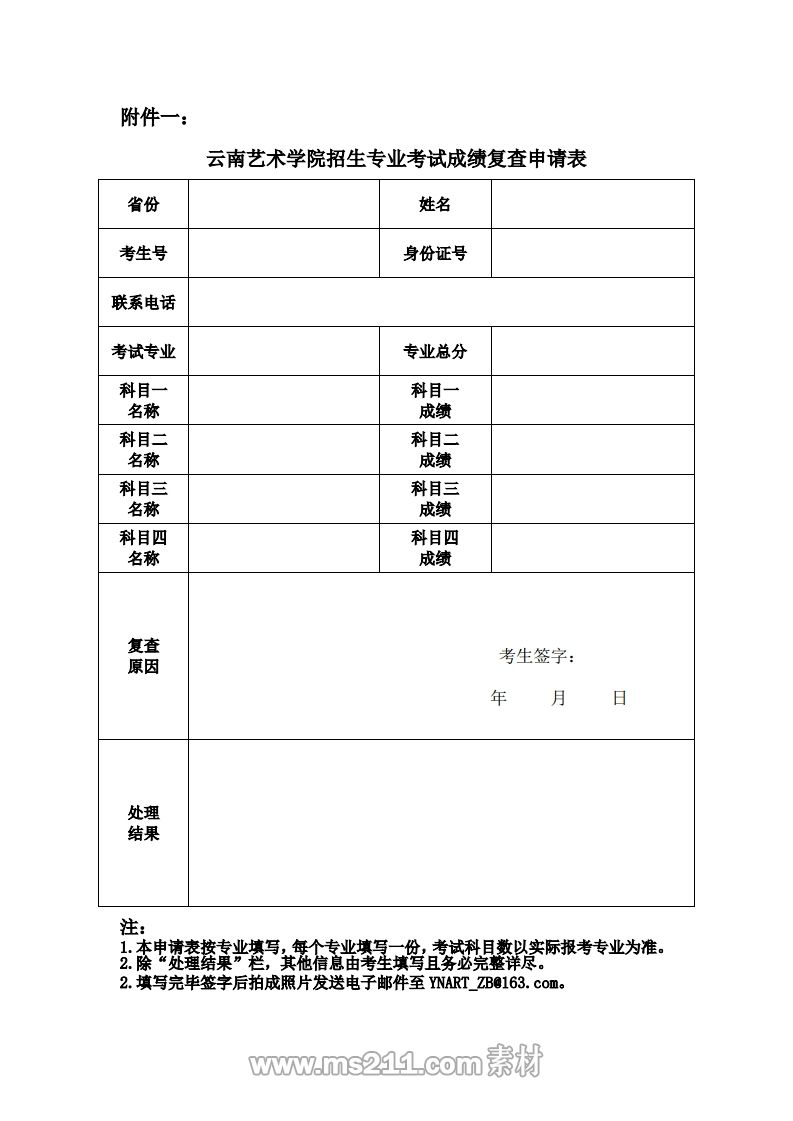 四、考生應(yīng)嚴(yán)格按照附件格式要求填寫成績復(fù)核申請表,并經(jīng)本人簽字后拍照發(fā)送電子郵件至YNART_ZB@163.com。