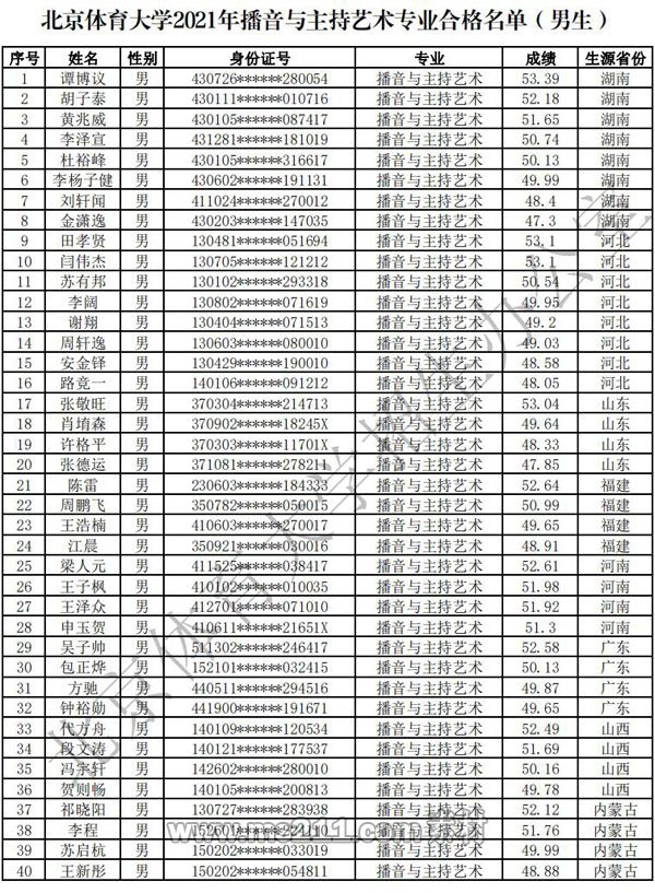 我校2021年播音與主持藝術(shù)專業(yè)共招生20人,合格名單及分省計(jì)劃確定原則是:從中國傳媒大學(xué)播音與主持藝術(shù)專業(yè)部分三試考生中按照專業(yè)成績排序,以男生前10名、女生前10名的省份分布情況確定分省計(jì)劃,根據(jù)不超過分省計(jì)劃數(shù)4倍比例,在相關(guān)省份考生中確定合格名單,詳情見附件。由于云南考生(女)只有3人,因此合格名單(女生)為39人。