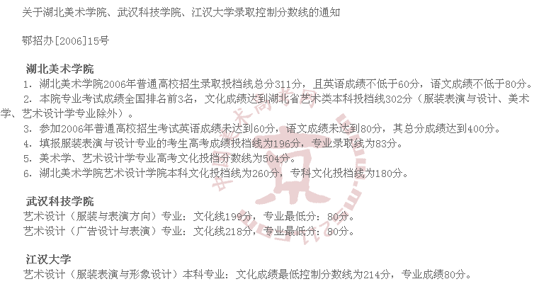 2006年湖北美術(shù)學(xué)院、武漢科技學(xué)院、江漢大學(xué)美術(shù)高考錄取分?jǐn)?shù)線