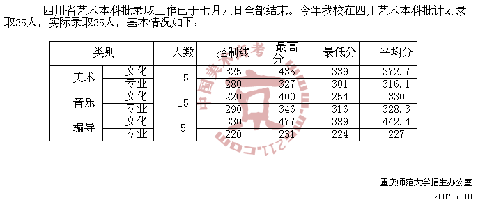 2007年重慶師范大學(xué)美術(shù)高考錄取分?jǐn)?shù)線