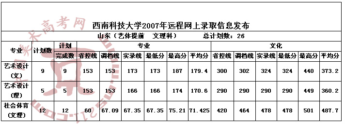 2007年西南科技大學(xué)美術(shù)高考錄取分?jǐn)?shù)線