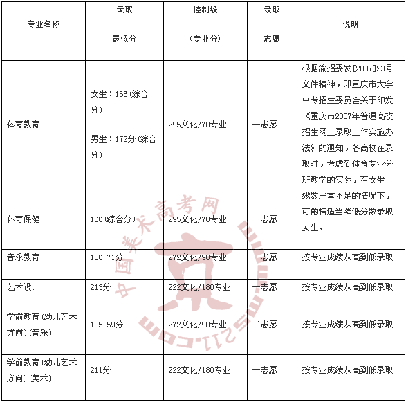 重慶文理學(xué)院2007年在重慶市藝術(shù)、體育?频匿浫」ぷ饕呀(jīng)結(jié)束,考生可通過(guò)本網(wǎng)站"普招錄取查詢"查詢錄取結(jié)果,分?jǐn)?shù)線見(jiàn)下表: