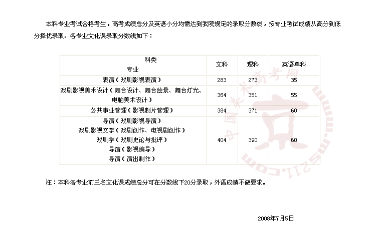 2008年中央戲劇學(xué)院美術(shù)高考錄取分?jǐn)?shù)線