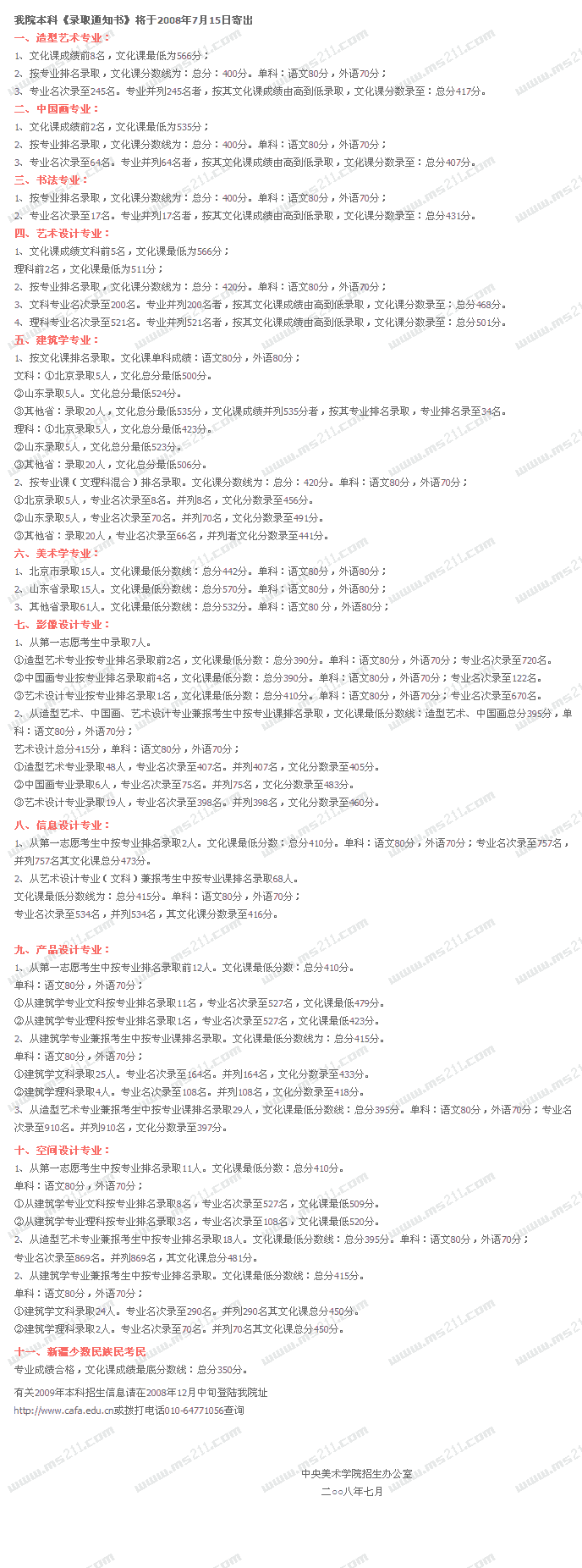 2008年中央美術(shù)學(xué)院美術(shù)高考錄取分?jǐn)?shù)線