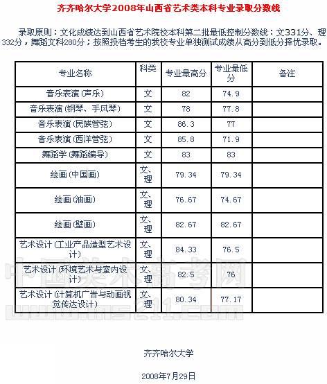 2008年齊齊哈爾大學(xué)美術(shù)高考錄取分?jǐn)?shù)線