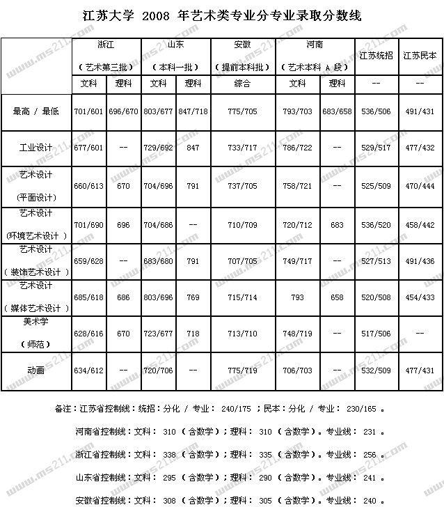 2008年江蘇大學美術高考錄取分數線