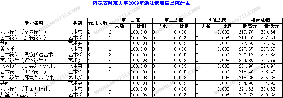 2009年內(nèi)蒙古師范大學(xué)浙江省藝術(shù)類錄取線