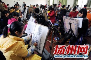 昨天上午8時30分,江蘇2009年普通高校招生美術(shù)專業(yè)統(tǒng)考正式開考。全省共設(shè)立南京師范大學(xué)、蘇州大學(xué)等6個考點。而我市揚州大學(xué)考點和新華中學(xué)考點則迎來揚州、泰州、淮安3個城市的12000余名考生。