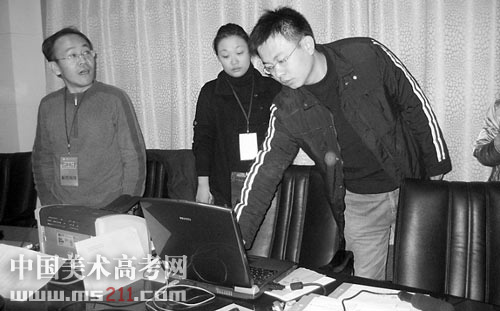 上午6:20,該校紀(jì)委副書記王進(jìn)生、教務(wù)處處長董占軍與操作人員分別在電腦上輸入各自掌握的密碼,打開素描科目試題的題庫,1000套試題開始循環(huán)滾動。然后,三家媒體的代表在電腦的鍵盤上隨機(jī)點(diǎn)中試題。其中,記者點(diǎn)中的試題是“ 默畫:中年女性頭像一幅”,另外兩家媒體代表抽出的題目是“含笑中年女子2/3側(cè)面頭像”和“戴眼鏡的中年男子頭像”。
