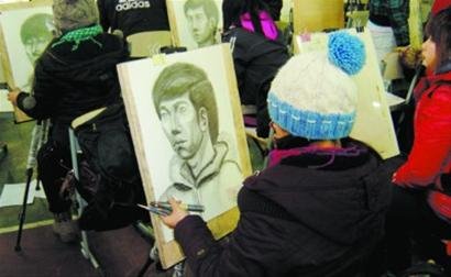 舞臺藝術(shù)、舞臺影像和戲劇影視服裝設(shè)計等5個專業(yè)的近千名考生統(tǒng)一在學(xué)校體育館進行素描考試。素描考題是:默畫男青年頭像,不能是側(cè)面和背面頭像的角度,F(xiàn)場不僅考生人數(shù)眾多,監(jiān)考也是隊伍龐大!岸际亲约寒嬜约旱模趺茨茏鞅啄?”記者發(fā)出疑問。工作人員解釋說:“因為考的默畫就是憑著記憶畫,為防止有的考生拿出手機對照著手機里的圖片畫,我們安排了40多名監(jiān)考,而且監(jiān)考還必須得走動相互換位置,也是為了防止考生照著監(jiān)考去畫。 ”