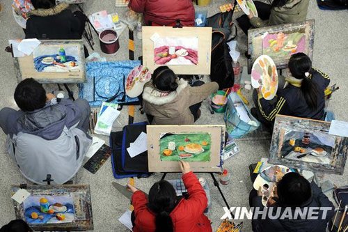齊齊哈爾的云兒從幼兒園開始學(xué)畫,嬌生慣養(yǎng)的她自從到了畫室,就全沒了脾氣。在這段考試季里,她連續(xù)參加了武漢科技大學(xué)、復(fù)旦大學(xué)、天津城市建設(shè)學(xué)院、重慶大學(xué)等高校美術(shù)招生專業(yè)考試。排長隊報名,背著沉重的畫板趕場考試,當(dāng)最后一場考完出來后,小姑娘就病倒了。很多學(xué)生都這么趕,為的是保底有大學(xué)讀。