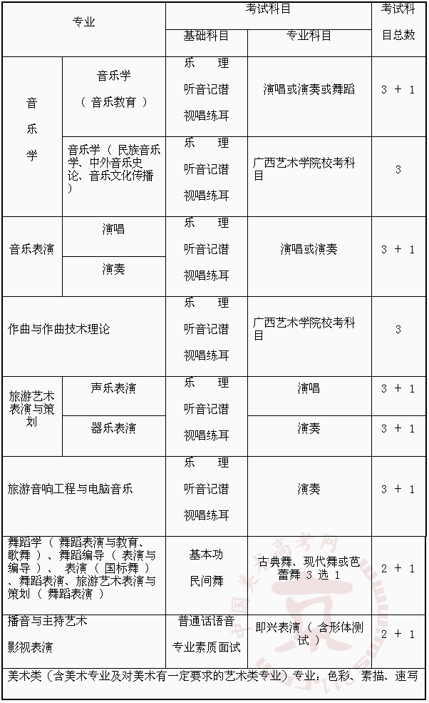藝術(shù)類專業(yè)全區(qū)統(tǒng)一考試科目一覽表