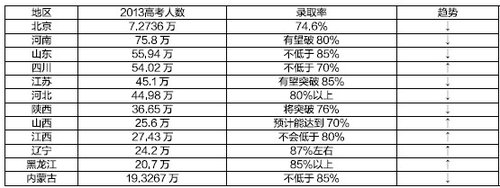 2013年全國高考報名考生共912萬人。從已公布的省份招生部門透露計劃情況來看,約七成省份錄取率或能超80%。