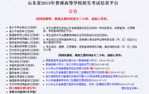 “今天在網(wǎng)吧里的多數(shù)是填報(bào)志愿的考生和家長,我們都害怕家里的網(wǎng)速慢,擠不進(jìn)網(wǎng)絡(luò),耽誤孩子報(bào)考,所以選擇在網(wǎng)吧報(bào)考,沒想到一上午沒進(jìn)去!边t先生說,幸虧截止時(shí)間推遲,才得以成功報(bào)考。而下午5點(diǎn)左右,記者看到,省招考院再次掛出公告,將報(bào)考截止時(shí)間從22日20時(shí)再次推遲到22日24時(shí)。