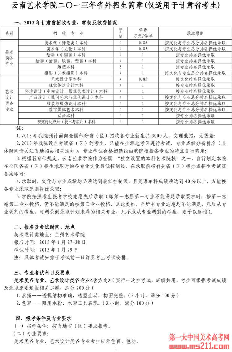 云南藝術(shù)學(xué)院2013年省外招生簡章(甘肅)