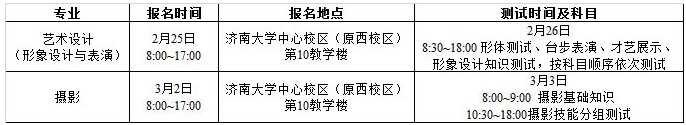 3、攝影、藝術設計(形象設計與表演方向)專業(yè)測試均由本校組織,報考該專業(yè)的考生(含外省考生)需到濟南大學參加專業(yè)測試。
