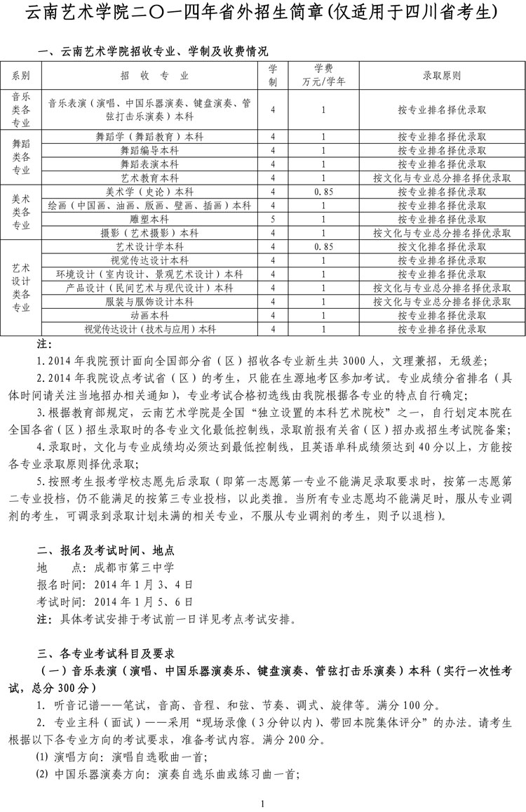 云南藝術學院2014年藝術類招生簡章(四川)