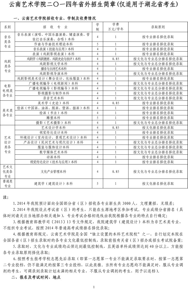 云南藝術(shù)學(xué)院2014年藝術(shù)類(lèi)招生簡(jiǎn)章(湖北)