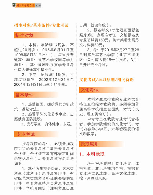 解放軍藝術(shù)學(xué)院創(chuàng)建于1960年,是中國人民解放軍唯一的一所多學(xué)科、綜合性高等藝術(shù)院校。學(xué)院下設(shè)文學(xué)、戲劇、音樂、舞蹈、文化管理、美術(shù)、軍事文化傳播7個系,開辦了研究生、本科、大專、中專學(xué)歷教育和軍隊干部任職教育、士官培訓(xùn)。學(xué)院座落在高校林立、文化藝術(shù)氛圍濃厚、高科技人才密集的北京市海淀區(qū)中關(guān)村。