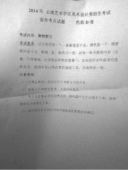 色彩考題:靜物默寫,以白瓷筆一個,油畫筆若干支、調色盒一個、錫管顏料若干支、眼睛一幅、裁紙刀一把、襯布一塊為畫面內(nèi)容(注意:不得增減、改變物品和物品數(shù)量),自由組織安排畫面構圖和關系,使用不易污損試卷的描繪工具,完色彩一幅。