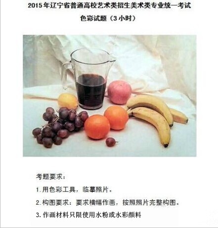 考試內容:給出圖片,一塊白色襯布上面擺放玻璃酒瓶、兩個黃梨、一個透明碗里面三個橘子一串葡萄、一個青色的盤子里面兩個西瓜,要求考生用水粉或水彩臨摹。