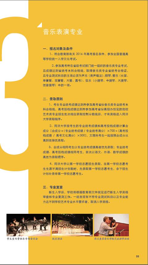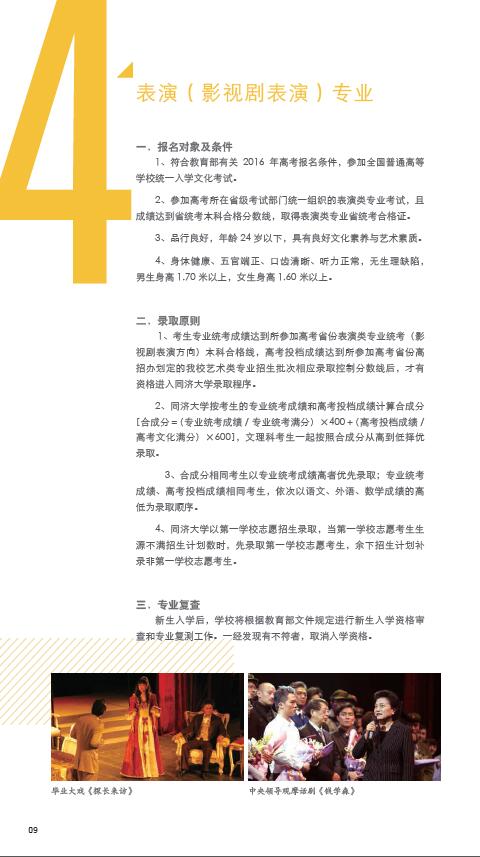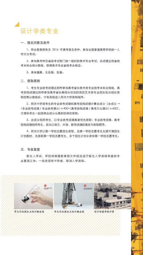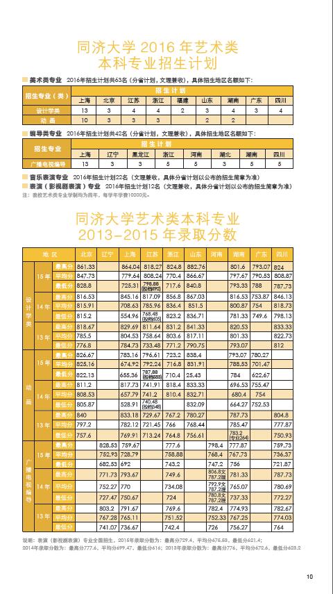同濟(jì)大學(xué)2016年藝術(shù)類本科招生專業(yè)含設(shè)計(jì)學(xué)類(產(chǎn)品設(shè)計(jì)、視覺(jué)傳達(dá)設(shè)計(jì)、環(huán)境設(shè)計(jì))、動(dòng)畫、廣播電視編導(dǎo)、音樂(lè)表演、表演(影視劇表演),學(xué)校不單獨(dú)組織?,承認(rèn)各招生省份對(duì)應(yīng)的省級(jí)藝術(shù)統(tǒng)考成績(jī)。具體各專業(yè)招生錄取規(guī)定請(qǐng)點(diǎn)擊查看或下載PDF文件:同濟(jì)大學(xué)2016年藝術(shù)類本科專業(yè)招生指南