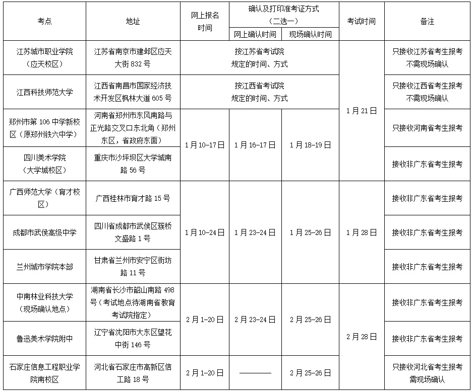 1、我校各美術(shù)類?紝I(yè)(除美術(shù)學(xué))在廣東省外設(shè)有十個考點(diǎn),分別安排在三個時間段組織考試,考點(diǎn)安排如下: