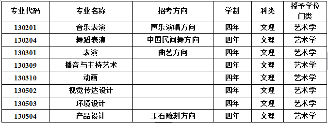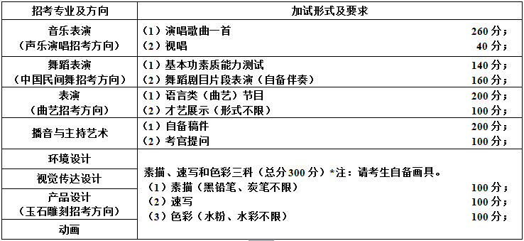 1)凡我校有藝術(shù)類專業(yè)招生計(jì)劃的省份,考生報(bào)考有?嫉乃囆g(shù)類專業(yè),報(bào)考考生須參加我校組織的藝術(shù)類專業(yè)考試,?紝I(yè)課成績(jī)合格,才能報(bào)考,按?紝I(yè)課成績(jī)計(jì)算錄取。否則,不能報(bào)考。