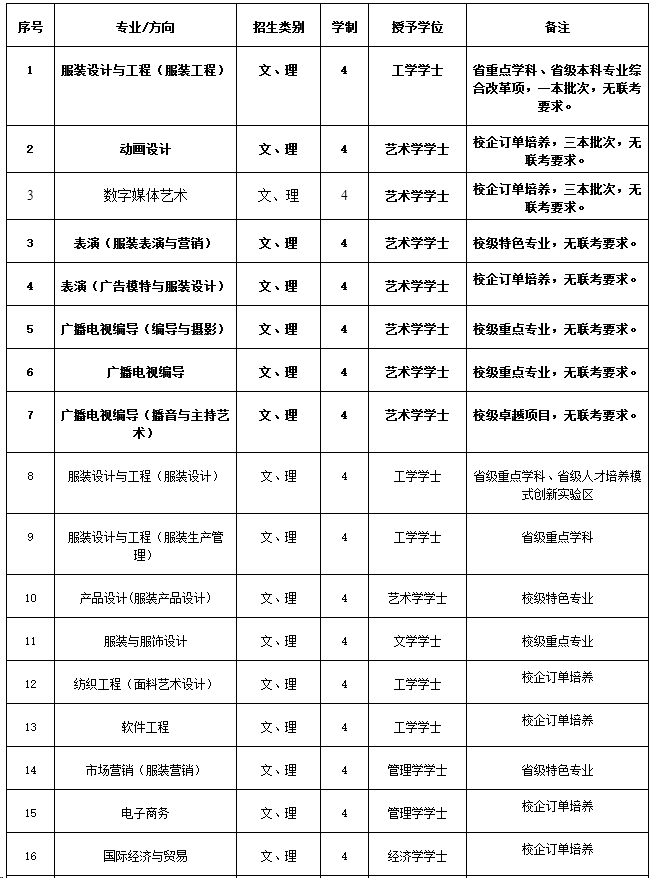 三、錄取批次:本科提前A批、本科二批。無聯(lián)考要求的專業(yè):服裝設(shè)計(jì)與工程(本科提前A批次),動畫、數(shù)字媒體藝術(shù)、播音與主持、廣播電視編導(dǎo),表演。