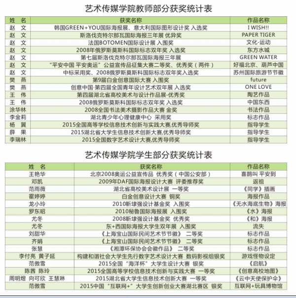 學(xué)院師生銳意進(jìn)取,在教學(xué)科研、學(xué)生培養(yǎng)、社會(huì)服務(wù)及專業(yè)競(jìng)賽等方面取得了豐碩成果。專業(yè)教師共獲得包括國(guó)內(nèi)外高規(guī)格設(shè)計(jì)大賽在內(nèi)的各類競(jìng)賽獎(jiǎng)200多項(xiàng),發(fā)表中文核心期刊在內(nèi)的學(xué)術(shù)論文百余篇,編寫出版特色教材30余部。學(xué)生獲中國(guó)大學(xué)生廣告藝術(shù)節(jié)學(xué)院獎(jiǎng)、靳埭強(qiáng)設(shè)計(jì)獎(jiǎng)、白金創(chuàng)意獎(jiǎng)、秘魯國(guó)際海報(bào)展、烏克蘭生態(tài)海報(bào)展、湖北省高校美術(shù)與設(shè)計(jì)展及全國(guó)各類設(shè)計(jì)創(chuàng)新大賽等獲得獎(jiǎng)項(xiàng)200多項(xiàng)。師生積極參加社會(huì)各類實(shí)際項(xiàng)目,并將實(shí)際項(xiàng)目引入教學(xué)課堂,采用工作室式教學(xué)方法,獲得采用幾十項(xiàng),贏得社會(huì)的認(rèn)可。
