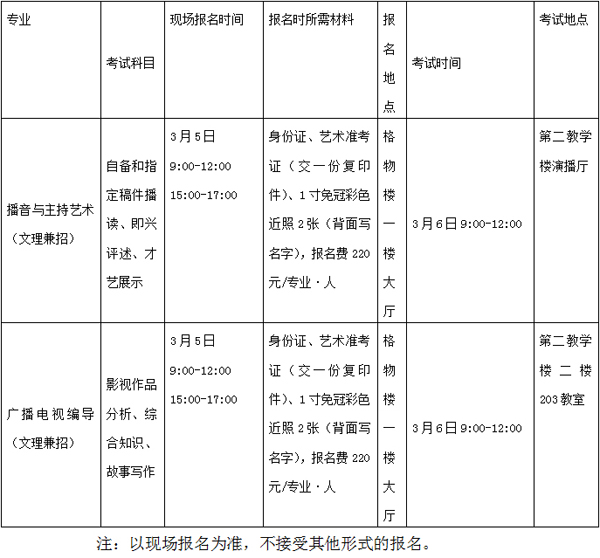 2、播音與主持藝術(shù)和廣播電視編導(dǎo)專業(yè),?汲煽兒细,按校考成績從高分到低分擇優(yōu)錄取;同等條件下參考相關(guān)科目成績和專業(yè)素質(zhì);
