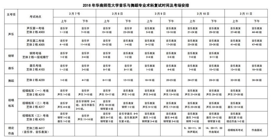 說明:1、復(fù)試按考生報考專業(yè)和主考項目分組進行考試,所有復(fù)試考生(除舞蹈考生外)必須在當(dāng)天按規(guī)定時間參加視唱練耳考試。