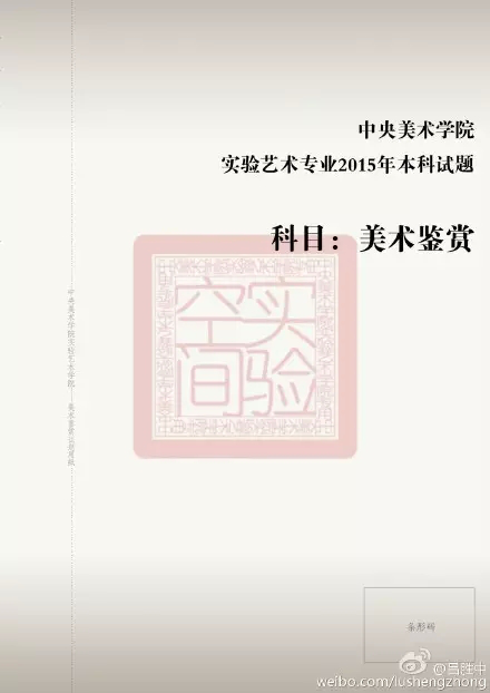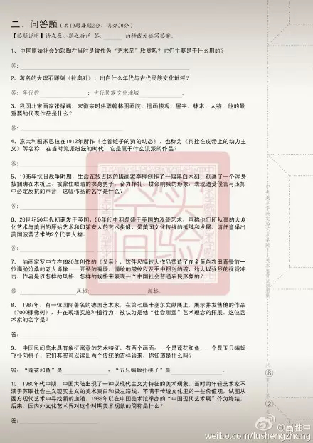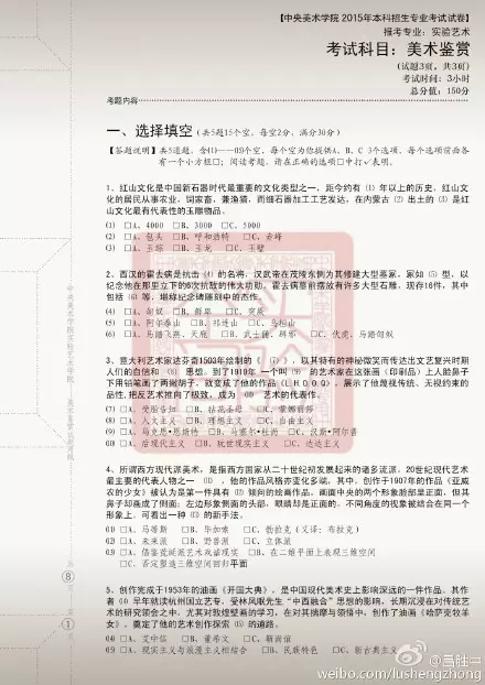 即選擇填空和問(wèn)答,共15道題,側(cè)重于對(duì)同學(xué)具體美術(shù)史知識(shí)點(diǎn)和美術(shù)理論常識(shí)的掌握和了解,對(duì)具體作品的年代及所屬派別是其出題重點(diǎn)。在出題點(diǎn)上對(duì)東西方藝術(shù)的早期探究(例如:原始彩陶、紅山文化、古希臘藝術(shù)等)和現(xiàn)當(dāng)代藝術(shù)的發(fā)展歷史(“85新潮”、博伊斯、波普等)是其重點(diǎn)。除了書本上的硬性知識(shí)點(diǎn)之外出題范圍還涵蓋了民間美術(shù)、現(xiàn)代主義藝術(shù)、后現(xiàn)代藝術(shù)、中國(guó)現(xiàn)當(dāng)代美術(shù)等內(nèi)容,出題面寬,考察面廣。除此之外,在題目形式上采用了一題多空,即對(duì)一個(gè)美術(shù)史知識(shí)進(jìn)行多角度考察,更加注重同學(xué)們的美術(shù)知識(shí)面而不是單純的對(duì)課本知識(shí)小點(diǎn)的死記硬背。應(yīng)該說(shuō),這樣的出題點(diǎn)體現(xiàn)出了實(shí)驗(yàn)藝術(shù)的一種出題思路,它要做的不是參考人文學(xué)院的美術(shù)史考察辦法對(duì)考生進(jìn)行通史性的知識(shí)考察,而是結(jié)合實(shí)驗(yàn)藝術(shù)的特點(diǎn)有針對(duì)的選擇。