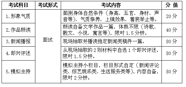 通過模擬主持廣播、電視、網(wǎng)絡(luò)等電子傳媒中不同類型的小欄目,考察考生的角色匹配、主持特質(zhì)、鏡頭形象、語言表現(xiàn)力及親和力、肢體副語言運(yùn)用情況等。