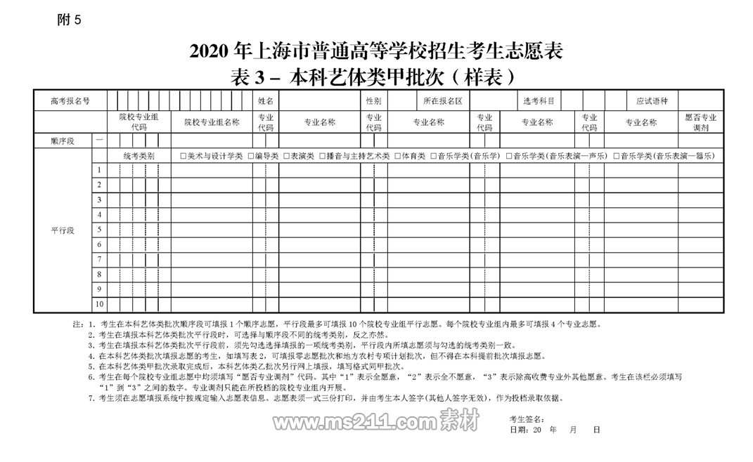 2020年上海市普通高等學(xué)校招生考生志愿表 表3-本科藝體類甲批次(樣表)