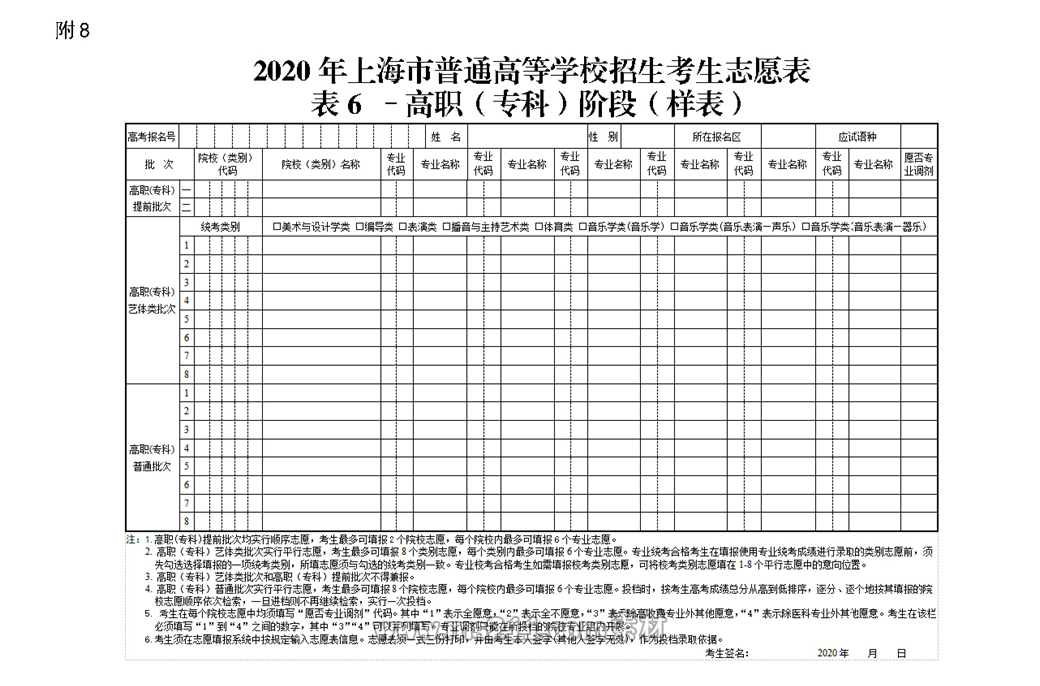 2020年上海市普通高等學(xué)校招生考生志愿表 表6-高職(專科)階段(樣表)