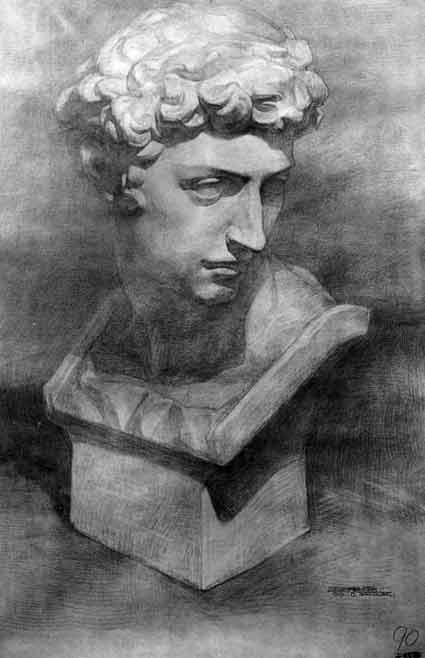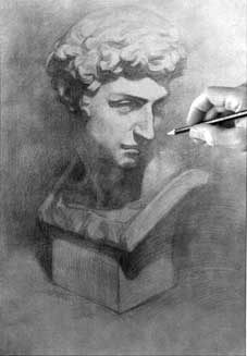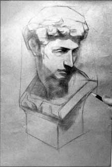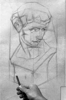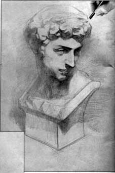 以形體結(jié)構(gòu)的相互組合來認識所畫的石膏形象,畫準形體的透視關(guān)系,處理好頭、頸、胸等的大的關(guān)系。