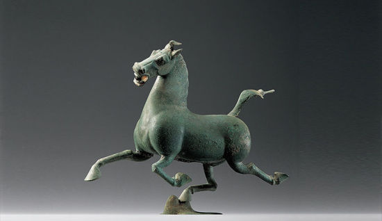 例舉漢代《馬踏飛燕》就是這類作品里的典范,如果學(xué)生能利用博物館觀看此作品為畫面,亦可以完成一張《穿越》的創(chuàng)作。因?yàn)樯锨晡奈锪鱾鞯浆F(xiàn)在即為一種“穿越”,何況《馬踏飛燕》本來就表達(dá)了飛速的奔跑概念。當(dāng)年美院創(chuàng)作高分卷《奔跑》一題中的這個(gè)畫面也可以完成“穿越”這樣一個(gè)主題。