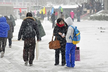 記者在北京城市學(xué)院考點(diǎn)冒雪采訪走出考場(chǎng)的考生