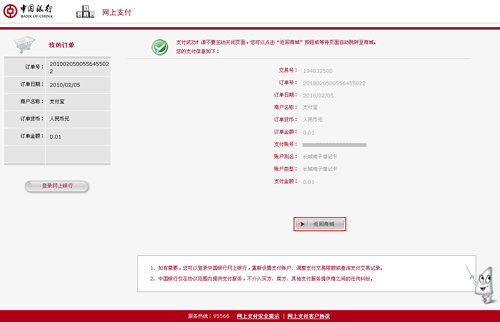 頁(yè)面顯示支付成功,以及支付的明細(xì)信息,請(qǐng)不要主動(dòng)關(guān)閉頁(yè)面,應(yīng)點(diǎn)擊“返回商城”或等待頁(yè)面自動(dòng)跳轉(zhuǎn),回到商戶頁(yè)面(圖13)。