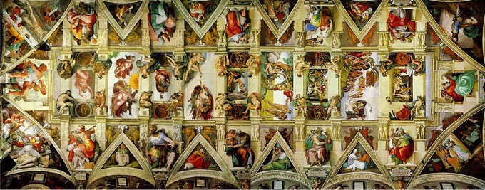 1512年11月1日,在西斯廷教堂的天花板上,人們看到了世界美術(shù)史上最大的壁畫之一—《創(chuàng)世紀(jì)》。這幅畫分為三組,共九個(gè)場景。第一組“神的寂寞”,包括“神分出光明與黑暗”、“神創(chuàng)造日、月、草木”、“神授福大地”;第二組“創(chuàng)造人類”,包括“創(chuàng)造亞當(dāng)”、“創(chuàng)造夏娃”、“逐出樂園”;第三組“洪水”,包括“洪水”、“諾亞獻(xiàn)祭”、“諾亞醉酒”。其中最引人矚目的是上帝與亞當(dāng)?shù)男蜗蟆啴?dāng)被創(chuàng)造出來了:一個(gè)有成熟的健美體格的美少年,他那洋溢著青春的生命剛剛從睡幻中蘇醒,還不能站立起來行動(dòng),等待著萬能的造物主給他以力量。上帝耶和華被畫成一位慈祥的老人,扶著天使們飛來,把有著無限力量的手伸向亞當(dāng),而亞當(dāng)將在握住上帝之手的剎那獲得生命和力量,作者以此表現(xiàn)出對解放人的力量的強(qiáng)烈渴望?!秳?chuàng)世紀(jì)》的問世,使當(dāng)世最偉大的雕塑家米開朗基羅成為與達(dá)·芬奇并峙的最偉大的畫家。在37歲時(shí),他被世人尊為“神圣的米開朗基羅”。