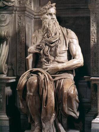 十六世紀(jì)初,教皇尤里烏斯二世向往給自己修建一座世界上絕無(wú)僅有的陵墓,并將著名的雕塑家米開(kāi)朗基羅招來(lái)為他工作。但由于教皇的反復(fù)無(wú)常,陵墓的施工幾起幾落,米開(kāi)朗基羅遭受到了一生中最大的失望。在陵墓已完成的雕塑中,最著名的就是這尊《摩西像》。摩西的眼睛又大又美,固定著直望著,射出火焰似的光。頭發(fā)很短,如西斯廷天頂上的人物一樣;胡須如浪花般直垂下來(lái),長(zhǎng)得要把手去支拂。臂與手像是老人的;血管突得很顯明;但他的手,長(zhǎng)長(zhǎng)的,美麗的,和多那太羅的絕然異樣。巨大的雙膝似乎與身體其它各部不相調(diào)和,是從埃及到巴勒斯坦至處奔波的膝與腿。它們占據(jù)全身面積的四分之一。