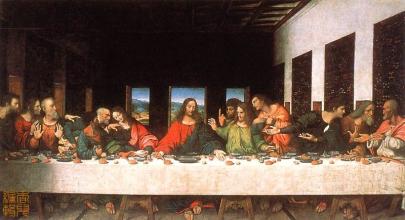 在慶祝逾越節(jié)的前夜,耶穌和他的十二門徒坐在餐桌旁,共進(jìn)慶祝逾越節(jié)的一頓晚餐. 餐桌旁共十三人,這是他們在一起吃的最后一頓晚餐.