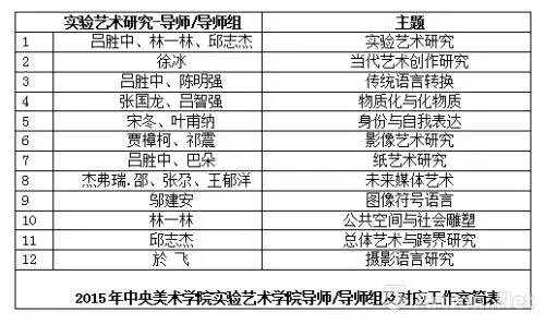 2015年,央美實驗藝術(shù)專業(yè)面向社會招收本科生,采取單獨招生方式。實驗藝術(shù)學(xué)院采取導(dǎo)師工作室制,設(shè)置十二個工作室,長期建設(shè)的目標(biāo)是面向全部的學(xué)歷與學(xué)位層次。