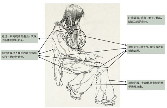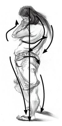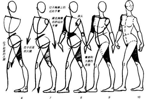 人體動態(tài)的變化豐富,并且牽一發(fā)而動全身。因此,除了要研究處于靜止?fàn)顟B(tài)的人體結(jié)構(gòu)及其局部運動規(guī)律外,還要將各部分串聯(lián)起來,認(rèn)真研究人體全 身的運動變化及某些規(guī)律。我們一般將人體歸納為“一豎(脊柱線)、二橫(兩側(cè)肩峰連線與兩側(cè)髂前上棘連線)、三體積(頭、胸廓、骨盆)、四肢(上肢與下肢)”。如何抓住動態(tài)線,關(guān)鍵是注意人體動作變化