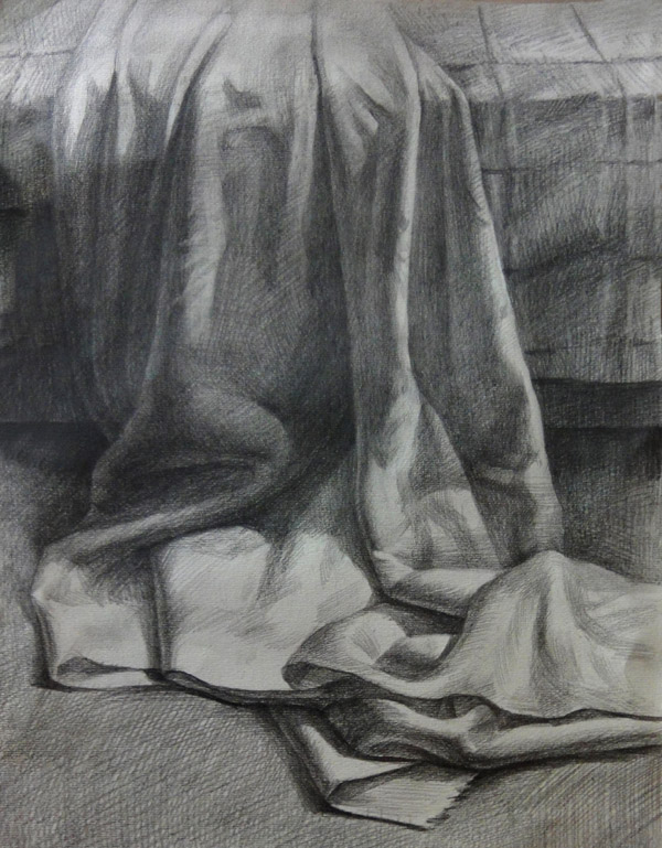 在素描靜物中襯布幾乎穿插在各種靜物組合排列中,畫好襯布其實不能,襯布雖然不像其它的靜物,但是襯布的形態(tài)多變,只有完全理解襯布的穿插于明暗起伏,才會在寫生襯布中,能運用的比較好。