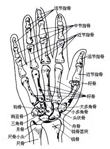 手的骨骼結(jié)構(gòu),手由緊密排列的8塊腕骨、5塊長(zhǎng)形的掌骨和14塊指骨構(gòu)成,整只手共有27塊骨骼、16個(gè)關(guān)節(jié)。